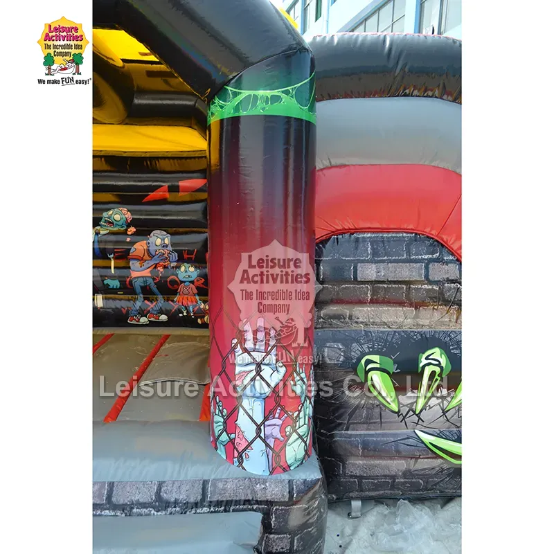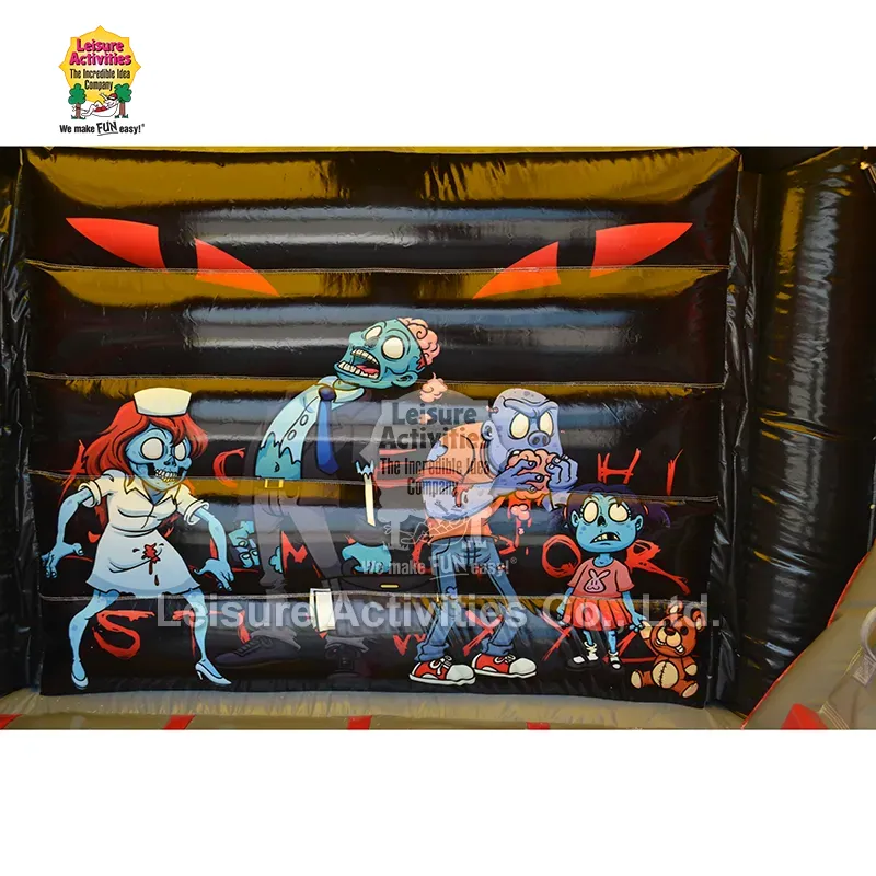 स्माल इन्फ्लेटेबल मल्टिप्ले बाउन्सी क्यासल हन्टेड विथ स्लाईड: यो Zombiethemed "Haunted Combo" inflatable लाई यसको रोमाञ्चक कार्टुन-हरर एस्थेटिकले बच्चाहरूलाई मोहित पार्न डिजाइन गरिएको हो। बोल्ड रातो, चम्किलो कालो र ईरी ग्रीन्स र ब्लूजको बोल्ड संयोजनले एक जीवन्त, रोमाञ्चक वातावरण सिर्जना गर्दछ। डायनामिक पोजहरूमा कार्टुन जोम्बीहरूको ठूला, चंचल ग्राफिक्स — जस्तै नर्स, मस्तिष्क खाने पात्र, र टेडी बियर भएको जोम्बी बच्चा — डराउने भन्दा बढी रमाइलो हुन्छन्। अन्तरक्रियात्मक तत्वहरू जस्तै छतमा क्रल गर्ने ठूला निलो जोम्बी, पर्खालहरूबाट पञ्जाहरू फुटेका हातहरू, र स्तम्भहरूमा चेन/ग्राफिक्सले कल्पनाशील खेललाई स्पार्क गर्छ। सुरक्षात्मक शीर्ष आवरणको साथ संलग्न संरचनाले छाया र हल्का वर्षा सुरक्षा प्रदान गर्दछ, जबकि संलग्न स्लाइडले साहसिक कार्यलाई थप गर्दछ। १० फिट उचाइले यसलाई इनडोर र बाहिरी दुवै प्रयोगको लागि बहुमुखी बनाउँछ, हेलोवीन पार्टीहरू, पतन उत्सवहरू, थीम्ड जन्मदिन घटनाहरू, र डरलाग्दो घरपछाडि रमाइलोमा पूर्ण रूपमा फिट हुन्छ।